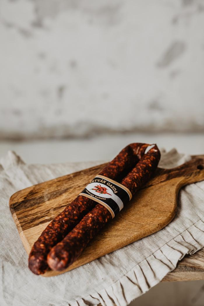 Hagyományosan készült, húsban gazdag magyar kézműves kolbász. A fűszerezés "csabai" típusú (fűszerpaprika, friss fokhagyma, köménymag, só). Csak a legkiválóbb minőségű fűszerek kerülnek a kolbászba az ízesítés során. A füstölés hagyományos paraszti praktikák szerint történik.